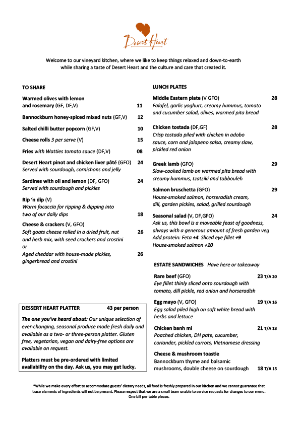 Welcome to our cellar door and vineyard kitchen where we like to keep things down-to-earth while sharing a taste of Desert Heart and the culture and care that created it through relaxed tastings of our new release and cellared wines and menu of snacks, lunch plates and the famous Desert Heart platter. Sit back and take in the magnificent 360-degree views of the Kawarau River, Mt Difficulty, gold sluicings and the mighty Pisa Range while we take care of you.
